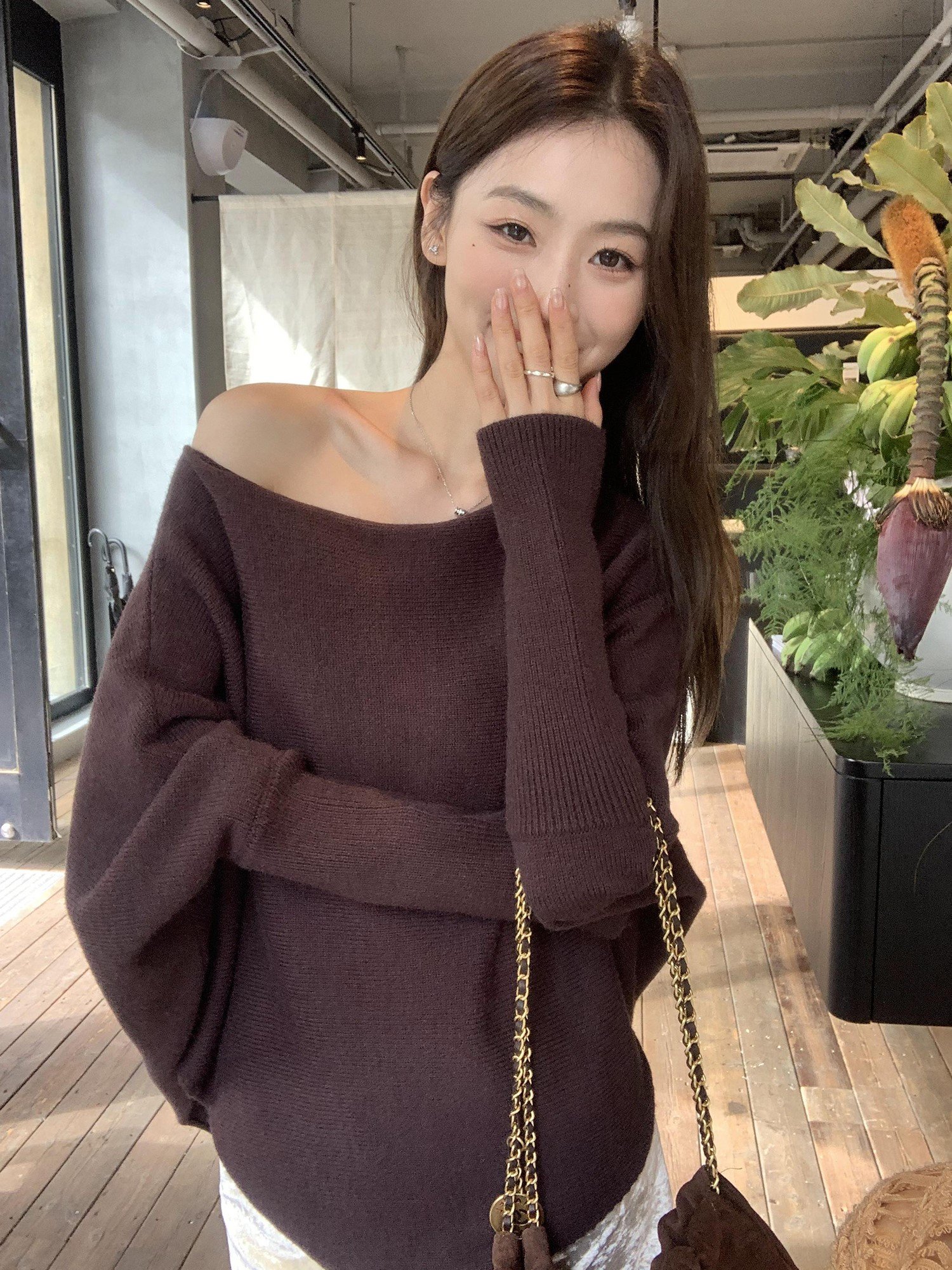 小兔棉 不規則蝙蝠袖一字肩毛衣 咖