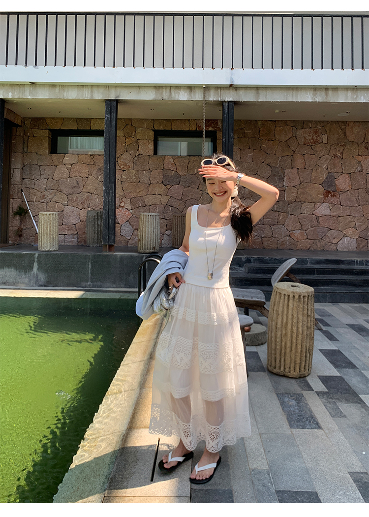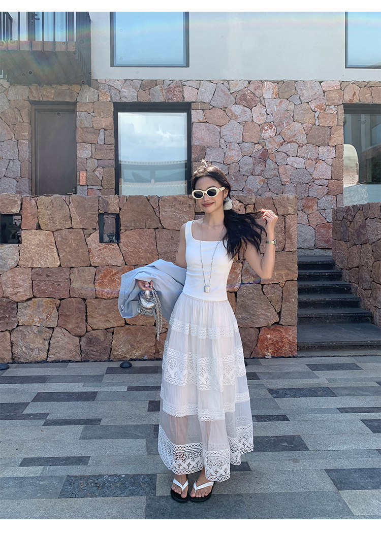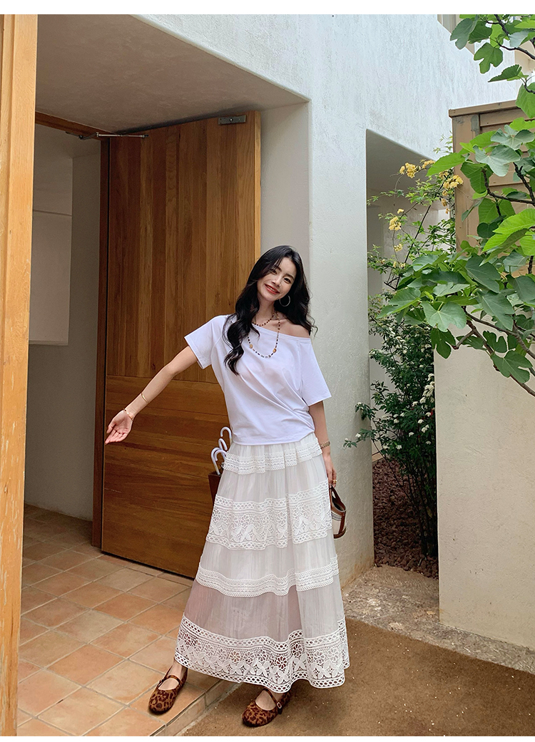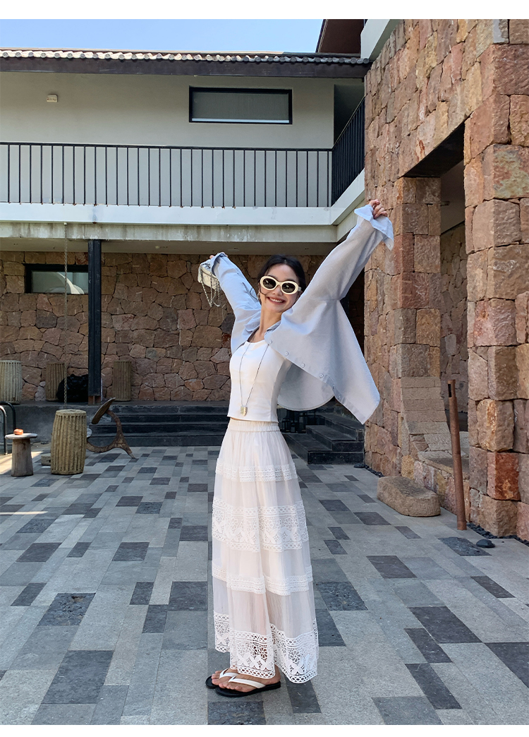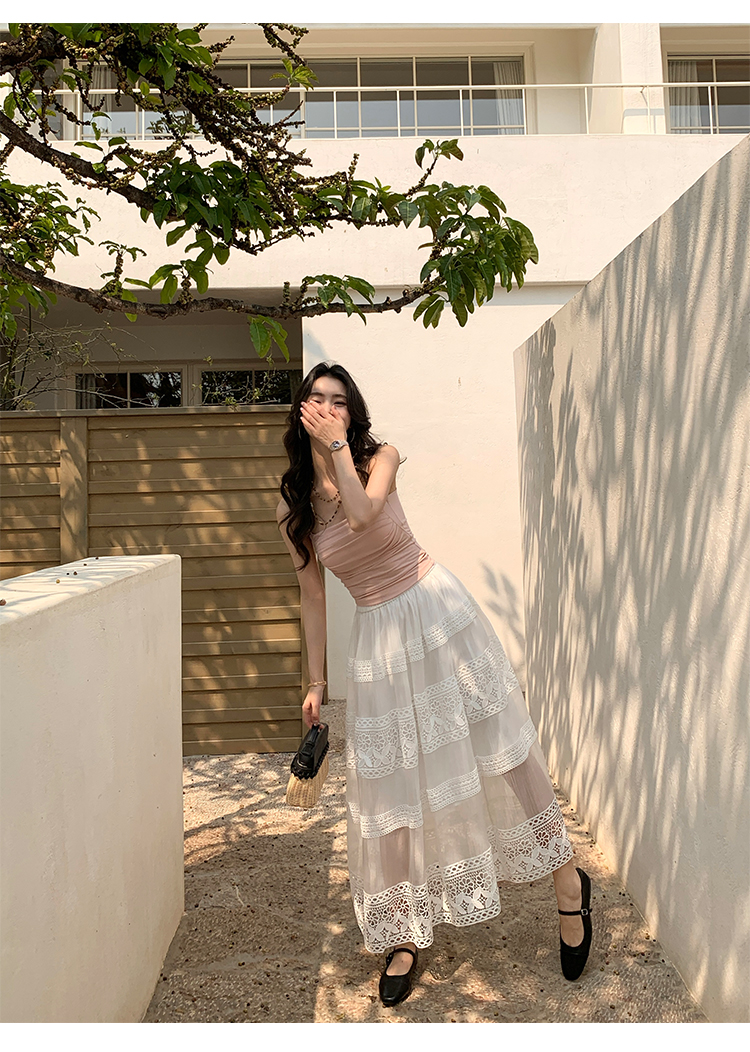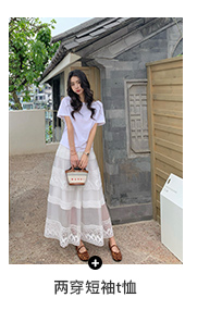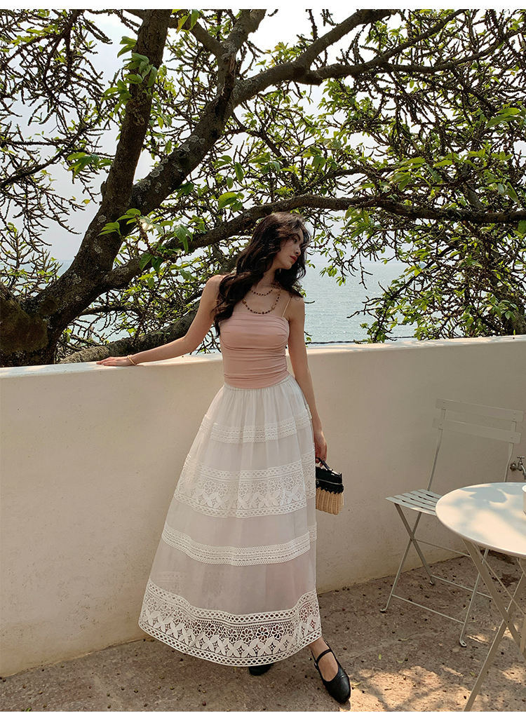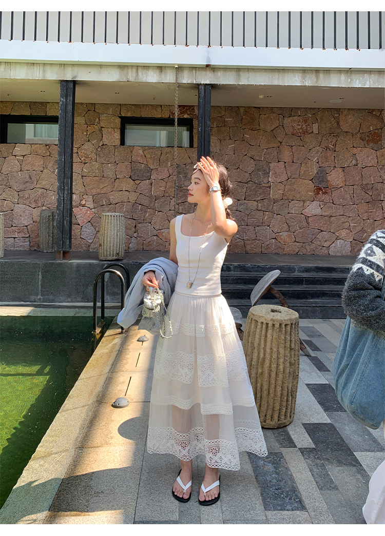 氛圍白裙 法式鏤空蕾絲蛋糕半裙