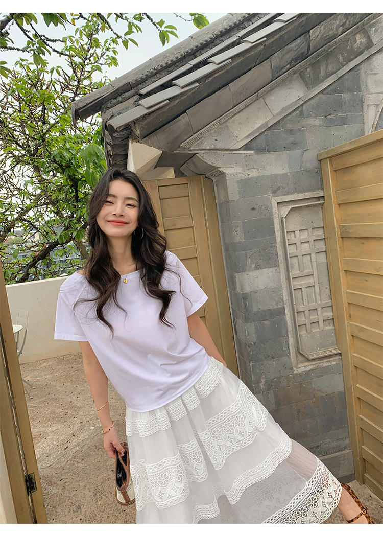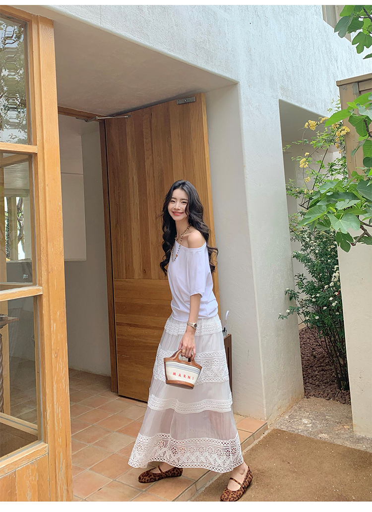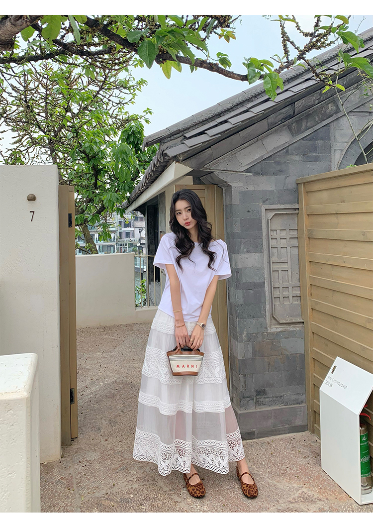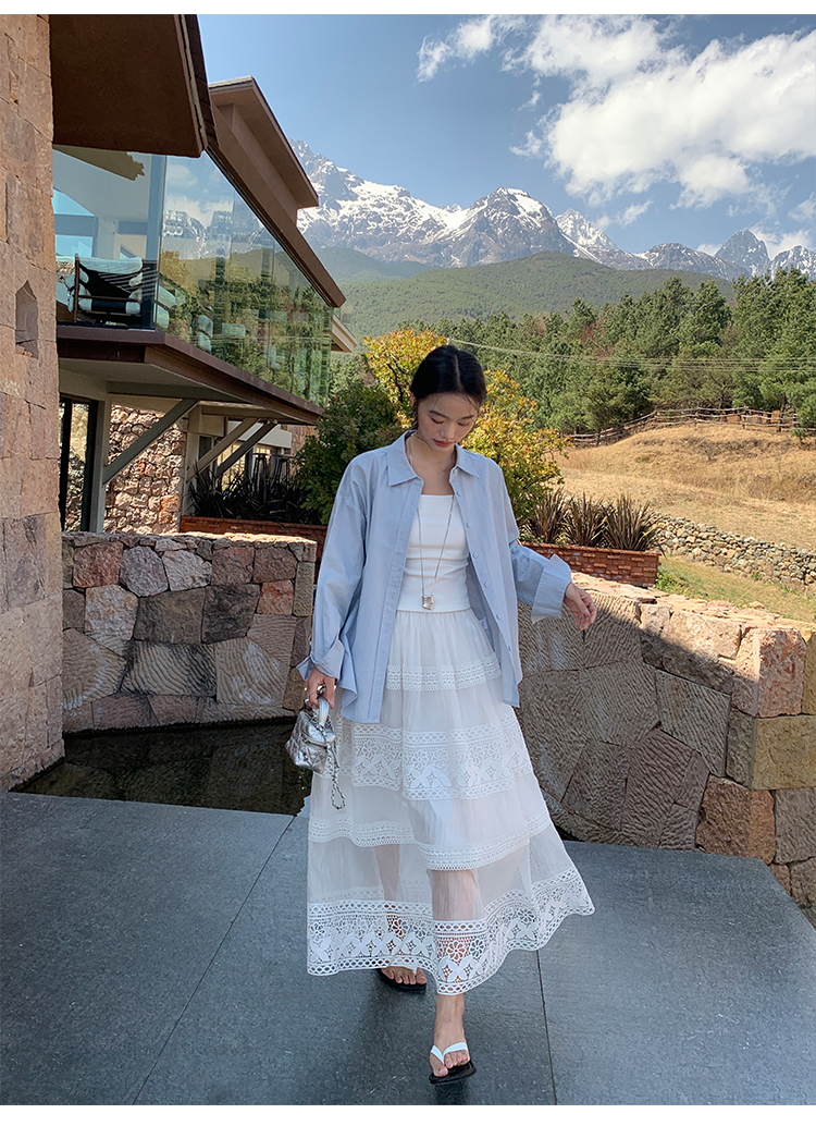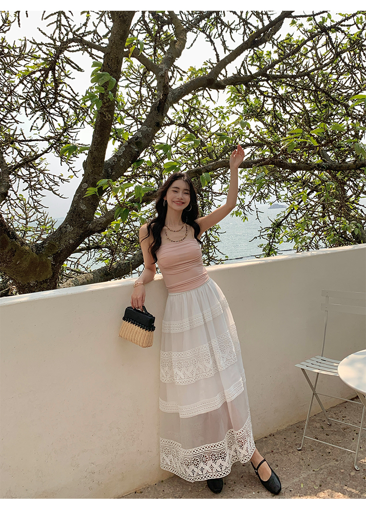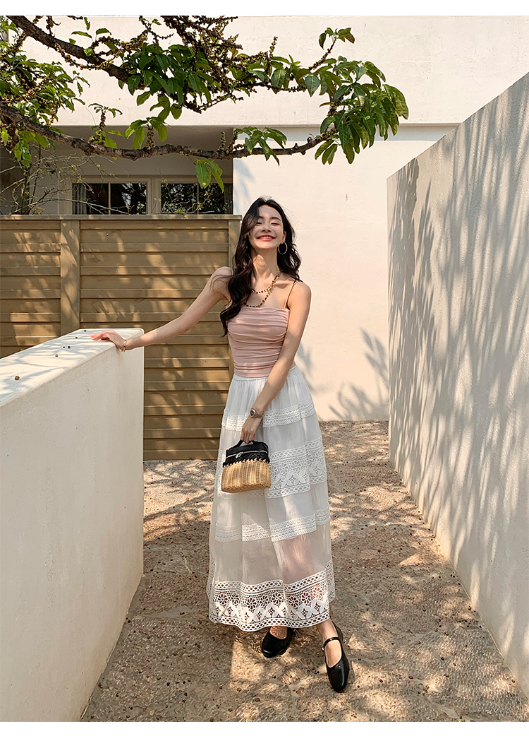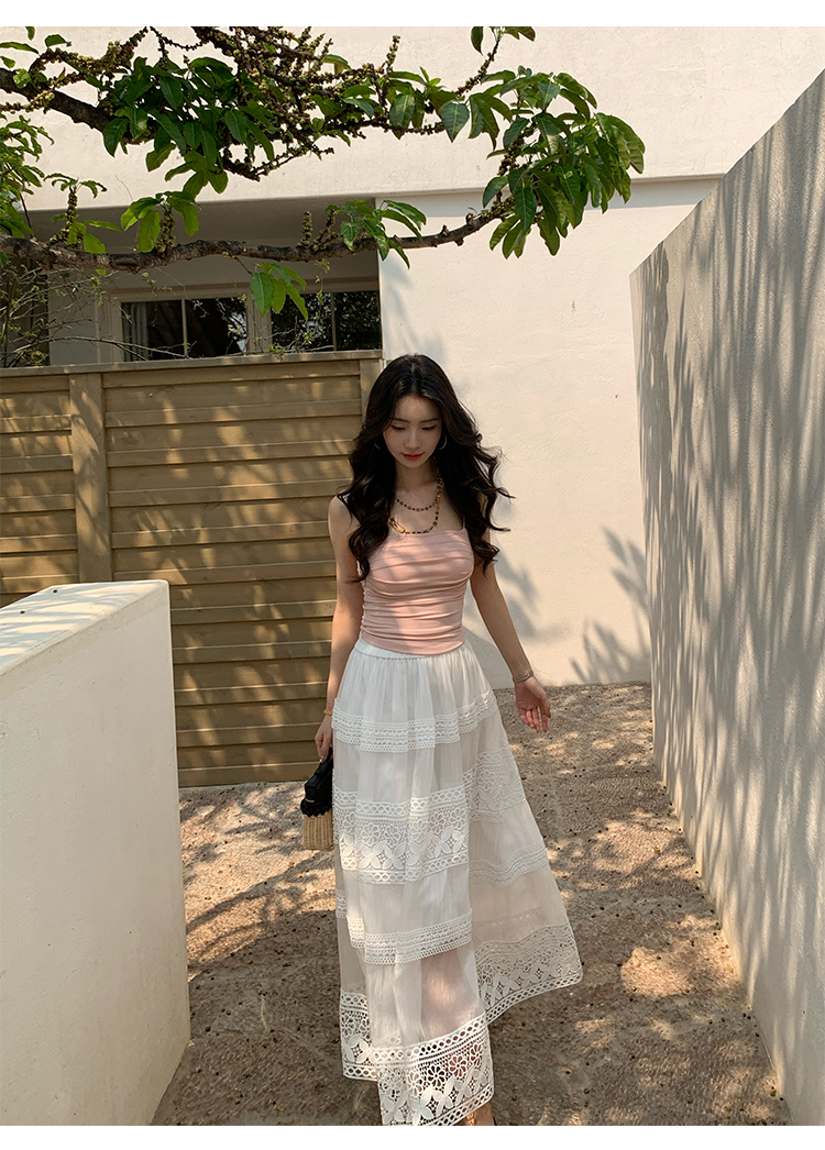 氛圍白裙 法式鏤空蕾絲蛋糕半裙