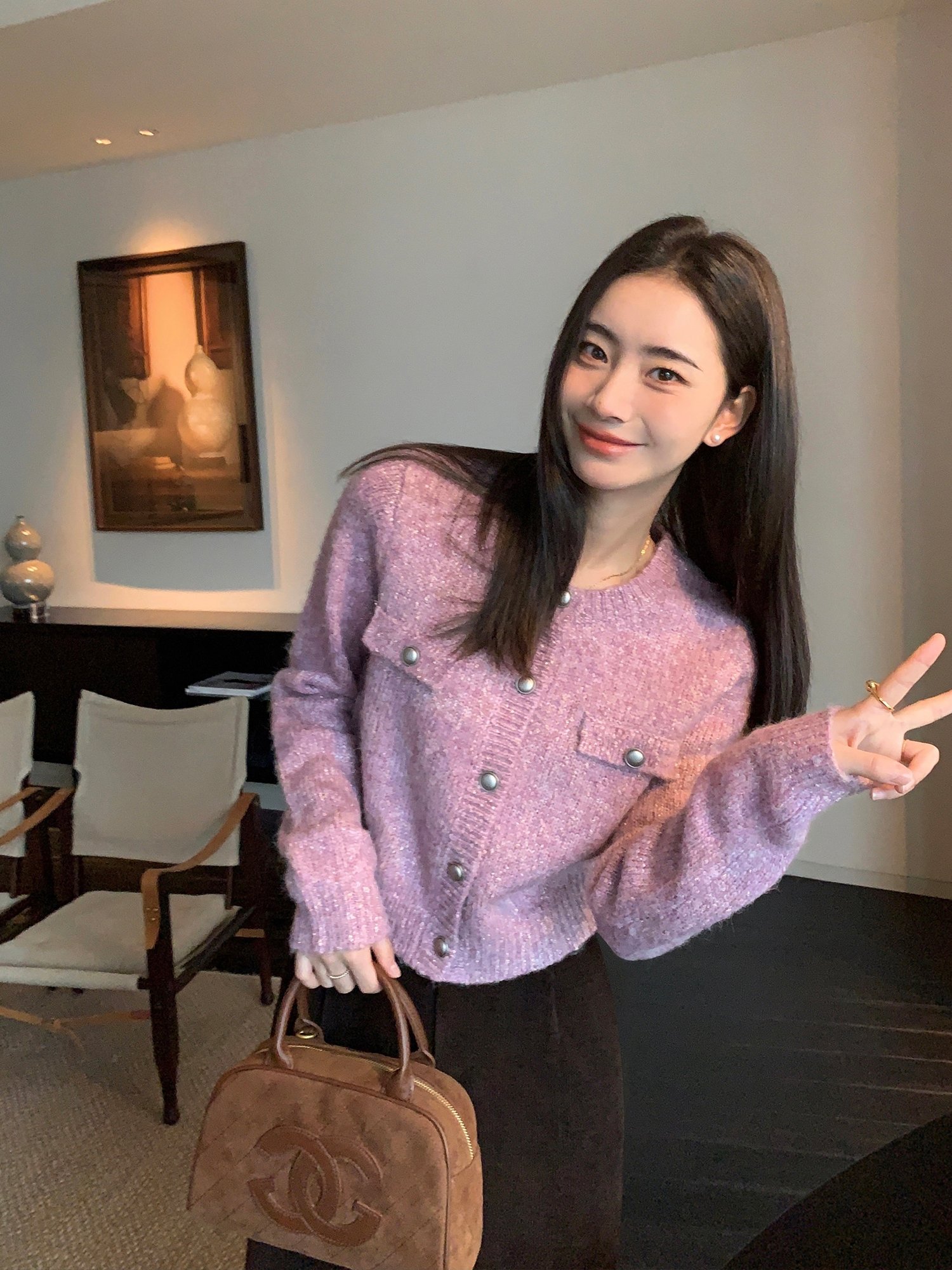 一眼萬年 三色金銀小香針織開衫 粉紫