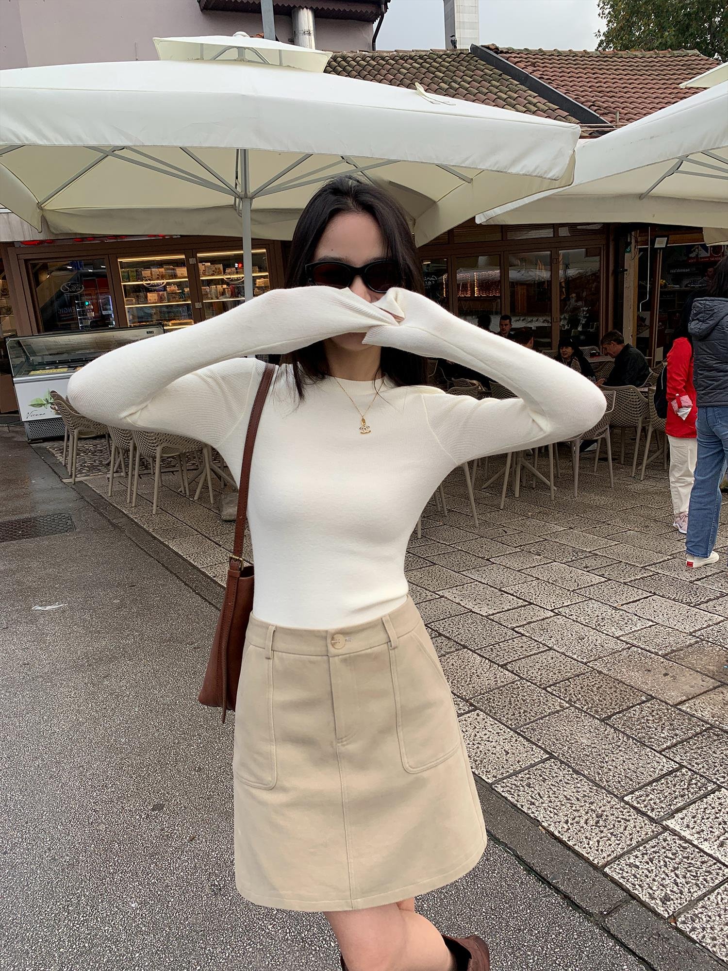 四色可選 圓領修身正肩上衣 米白