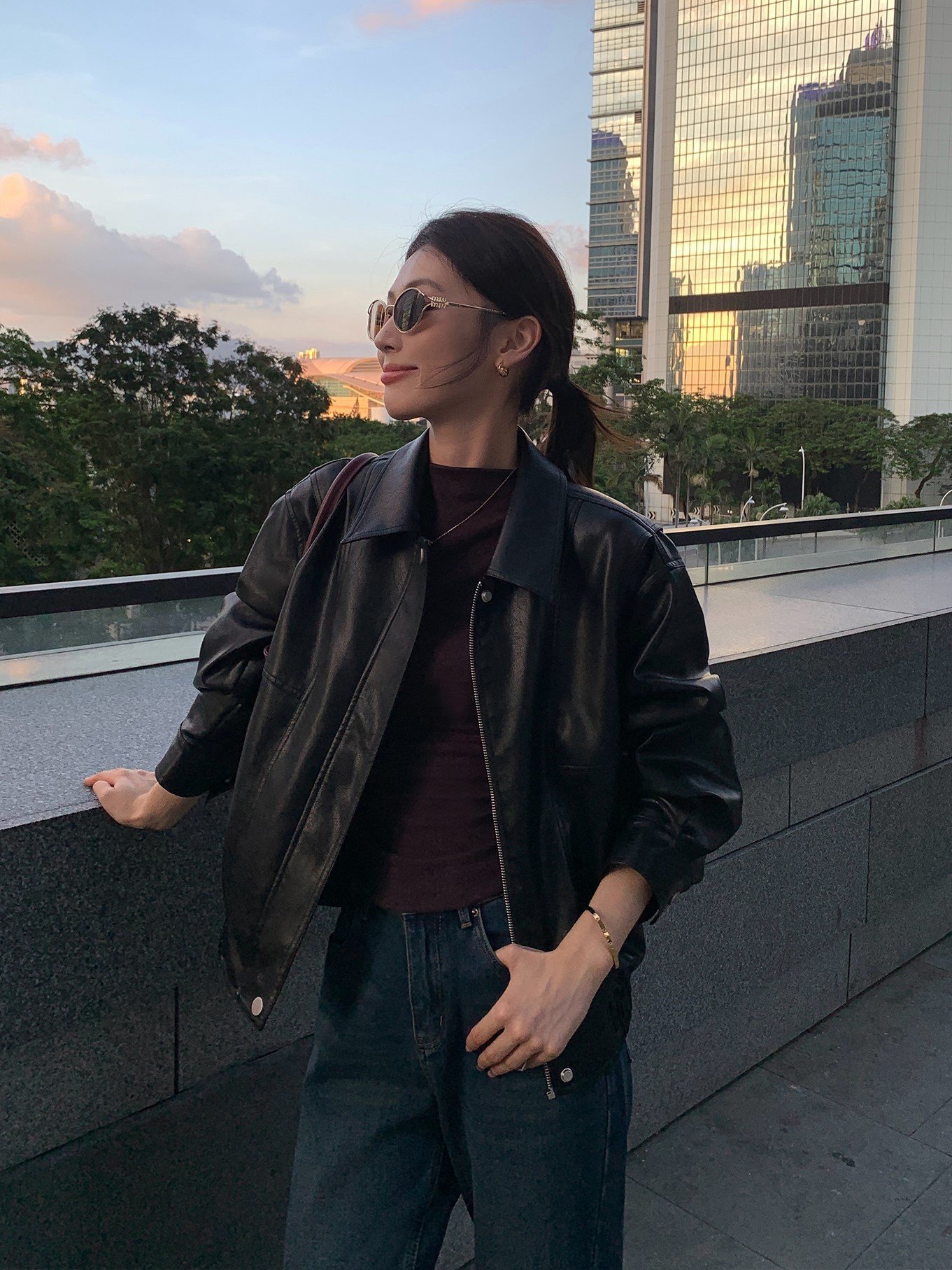 小眾玩家 輪廓翻領短版皮夾克 黑