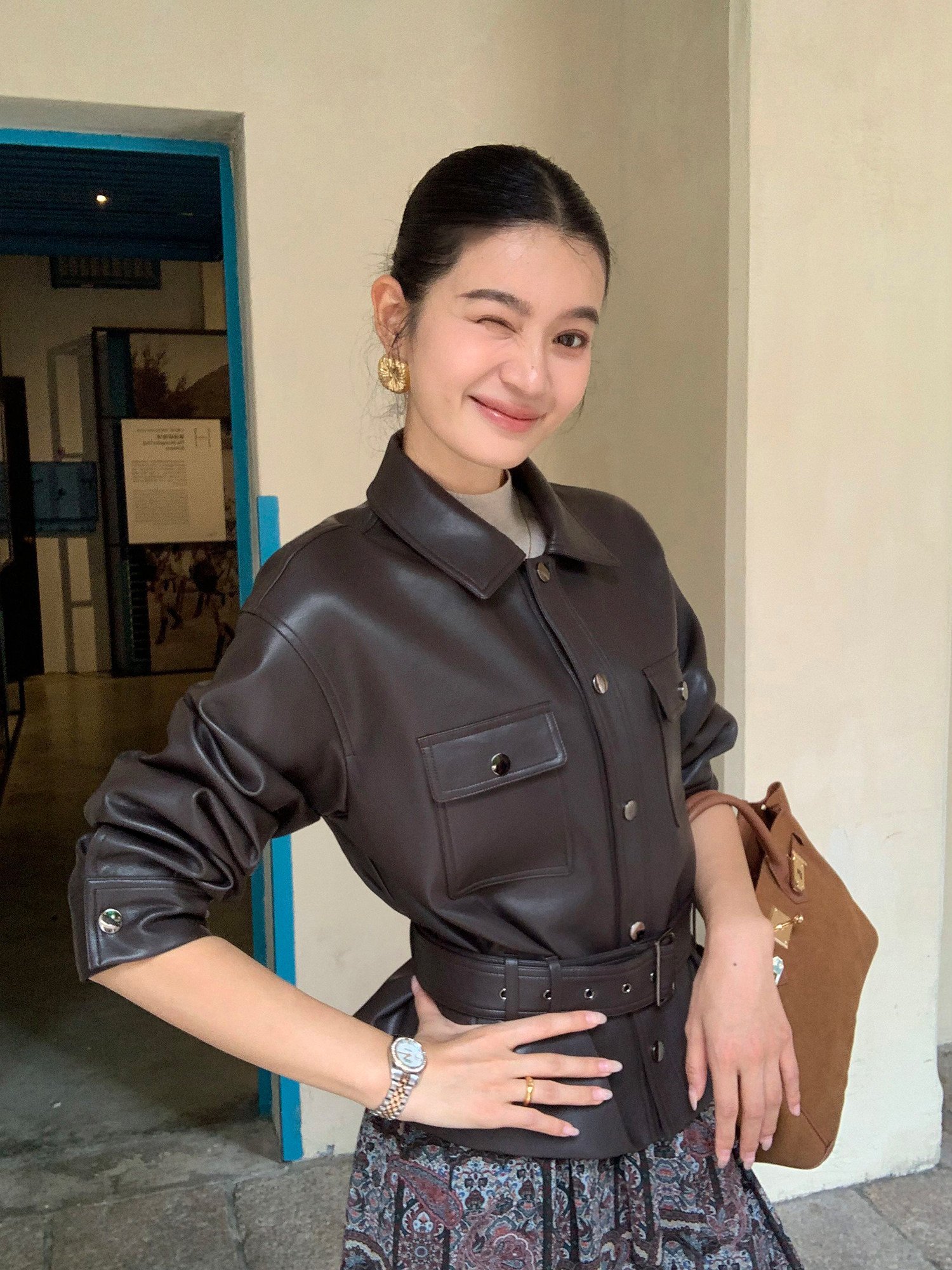 帥氣擔當 可拆腰帶設計皮夾克 棕