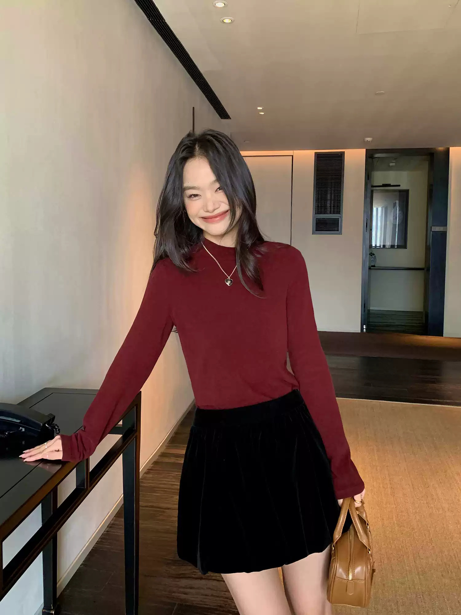 絨絨雪花 保暖半高領內搭針織衫 酒紅