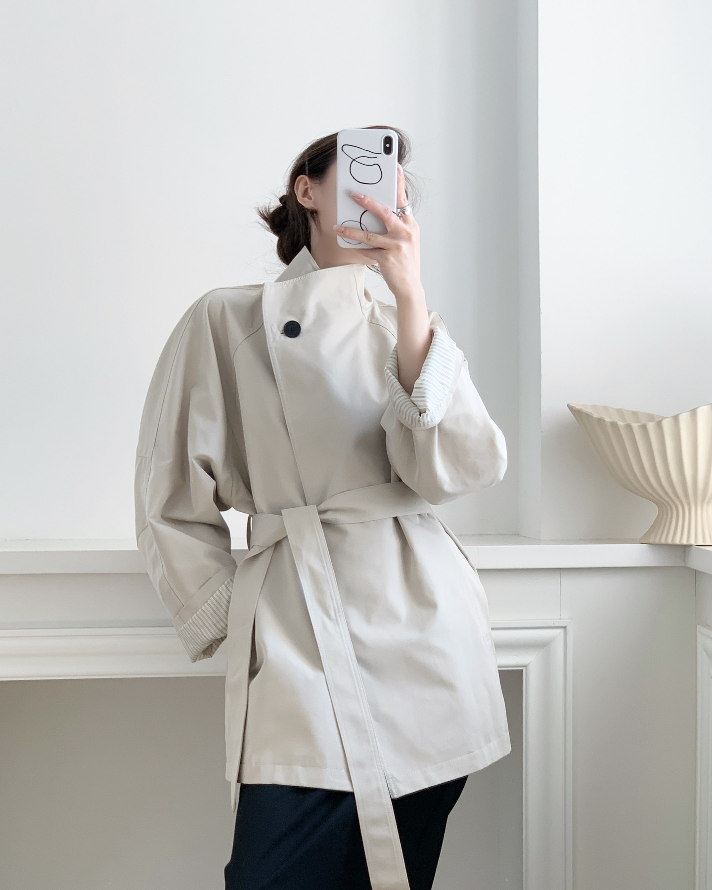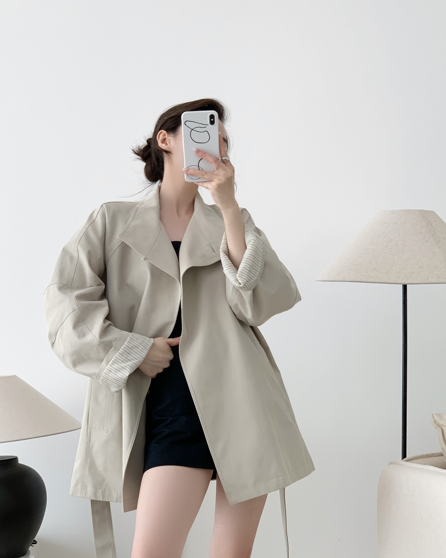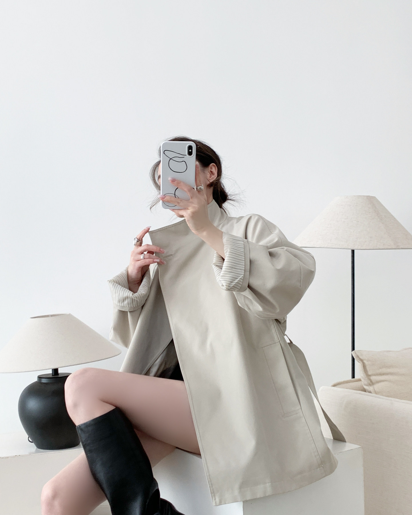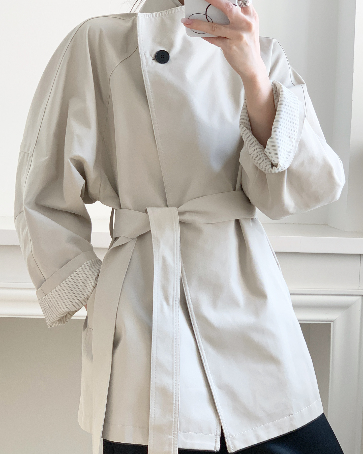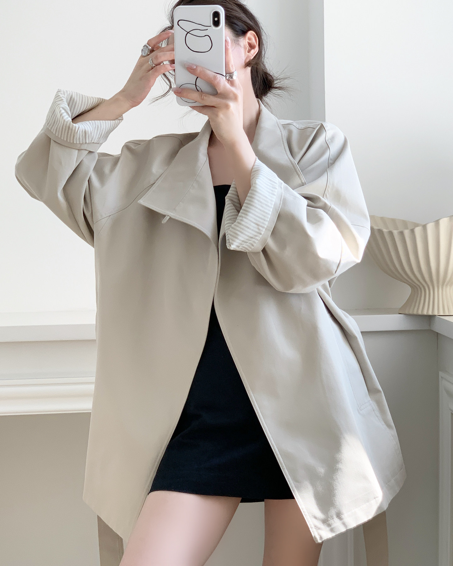 版型寬鬆休閒與通勤並存,長款百搭且氣場強,短款慵輕鬆幹練,布料選用斜紋棉混紡布料,挺括有型,立領設計簡約大氣,領子簡約一粒明扣設計,營造自然斜門襟效果,胸部兩側有貼袋設計,豐富層次感,袖口拼接條紋袖裡,翻折穿著時增加休閒細節。