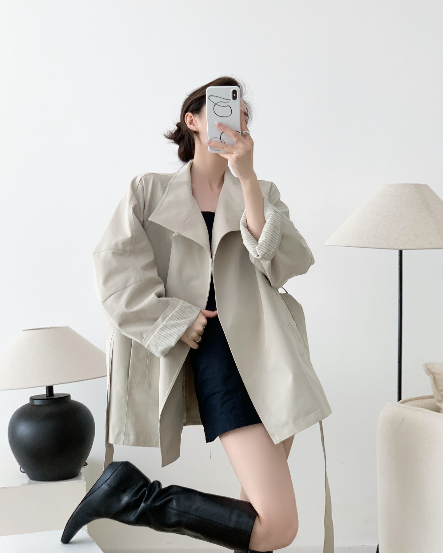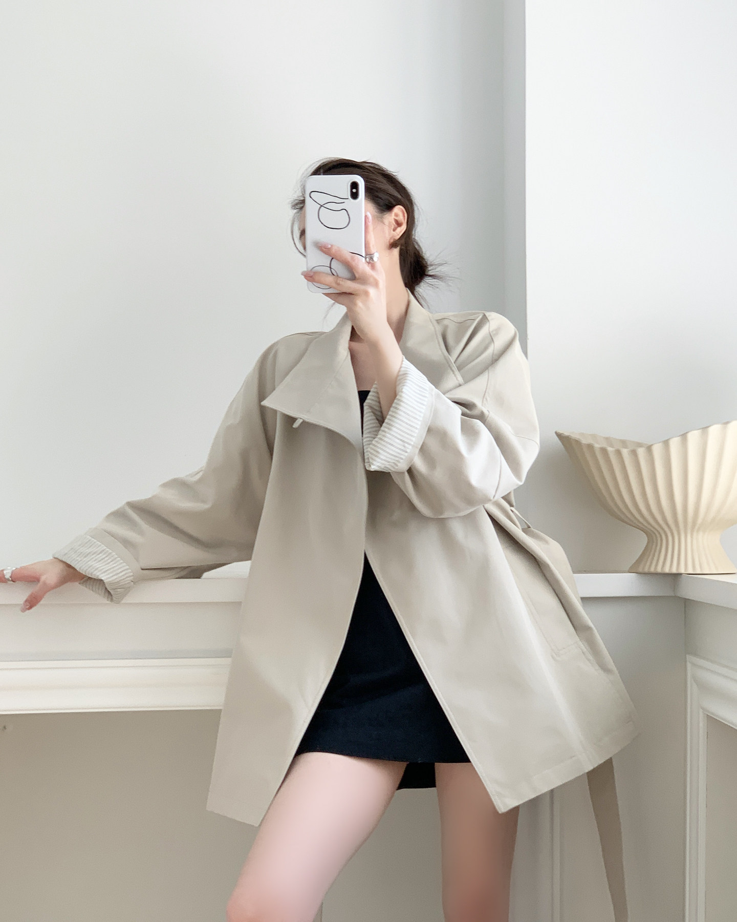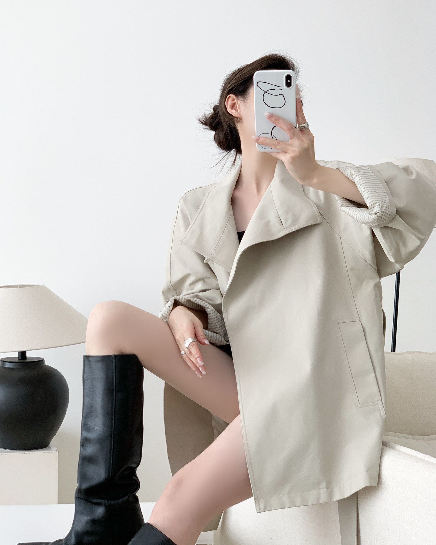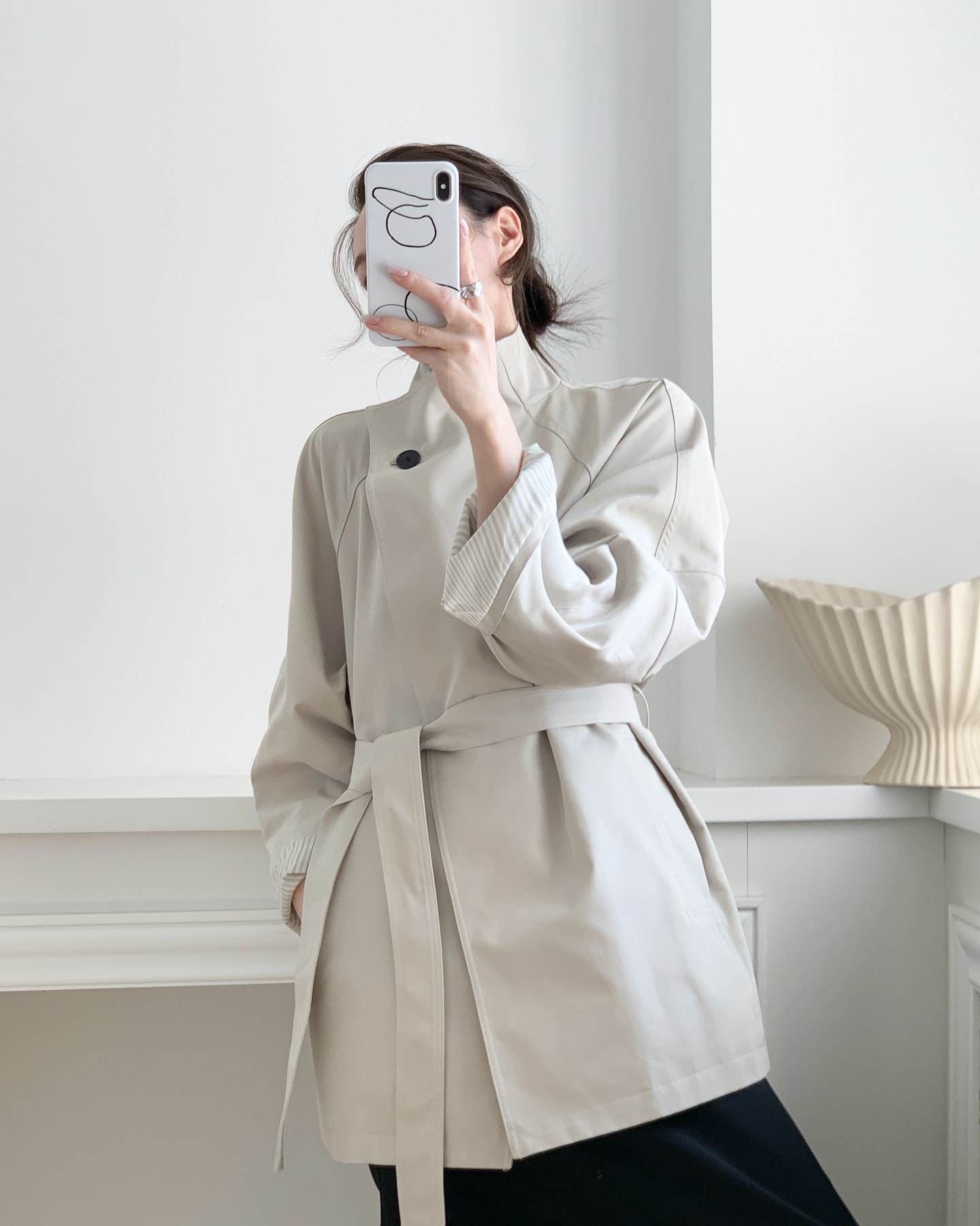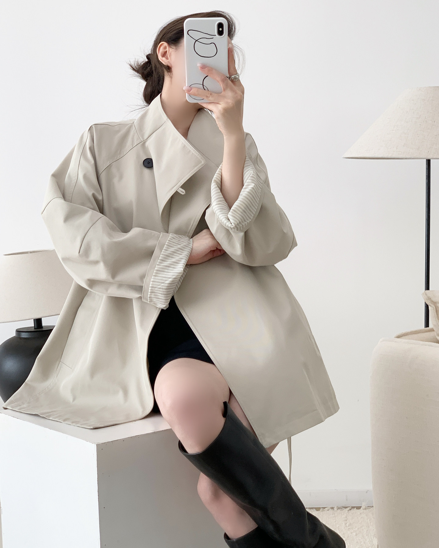 版型寬鬆休閒與通勤並存,長款百搭且氣場強,短款慵輕鬆幹練,布料選用斜紋棉混紡布料,挺括有型,立領設計簡約大氣,領子簡約一粒明扣設計,營造自然斜門襟效果,胸部兩側有貼袋設計,豐富層次感,袖口拼接條紋袖裡,翻折穿著時增加休閒細節。