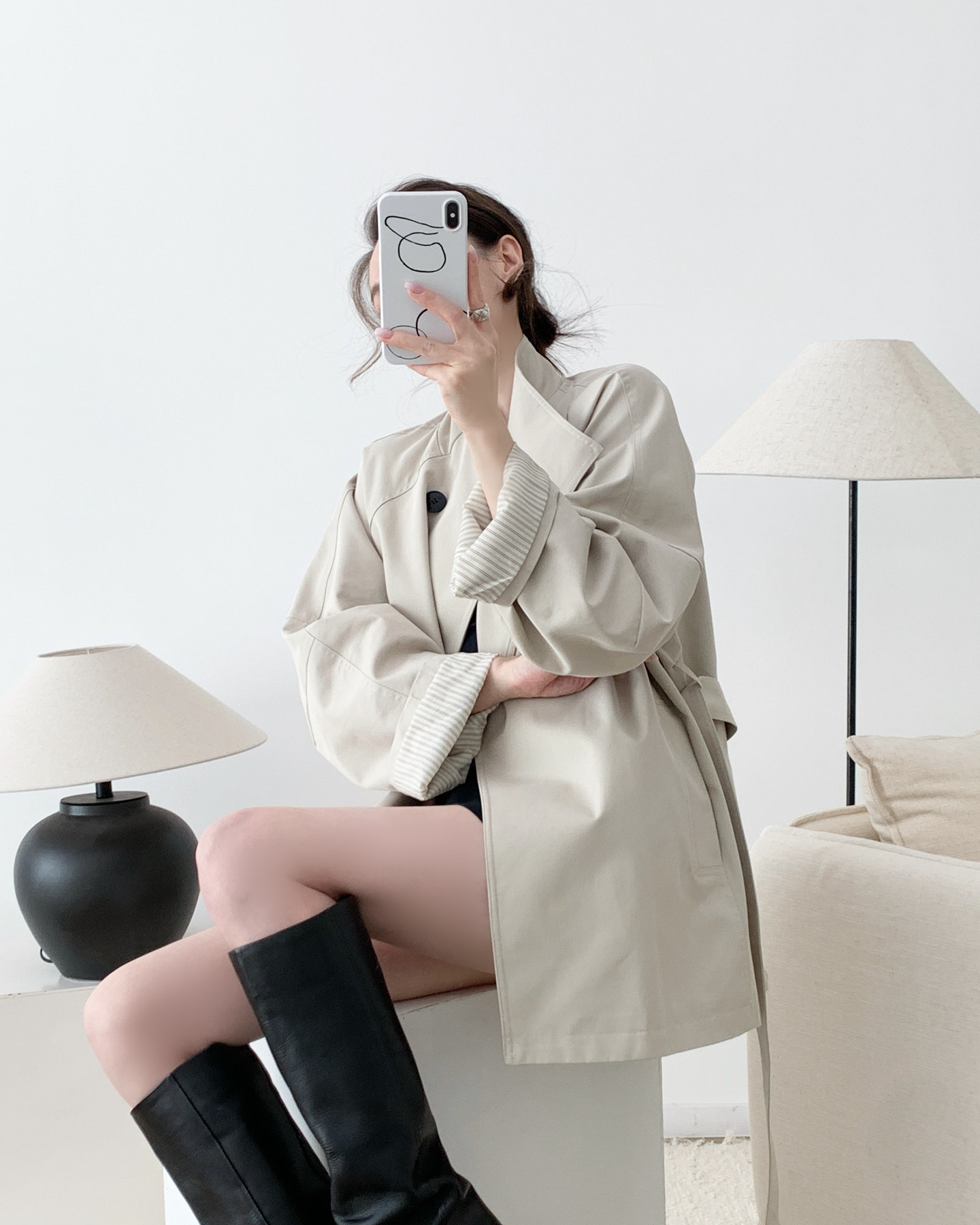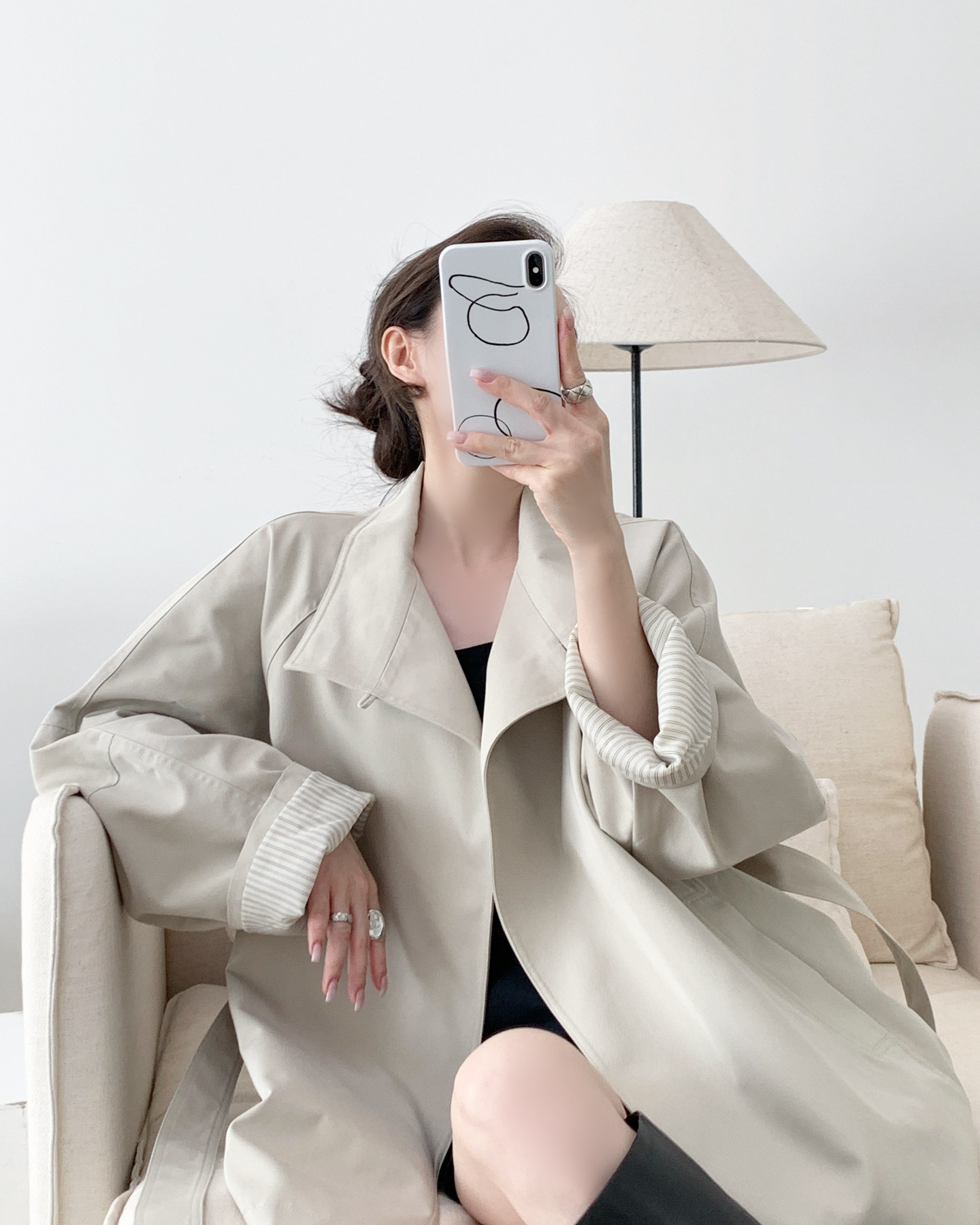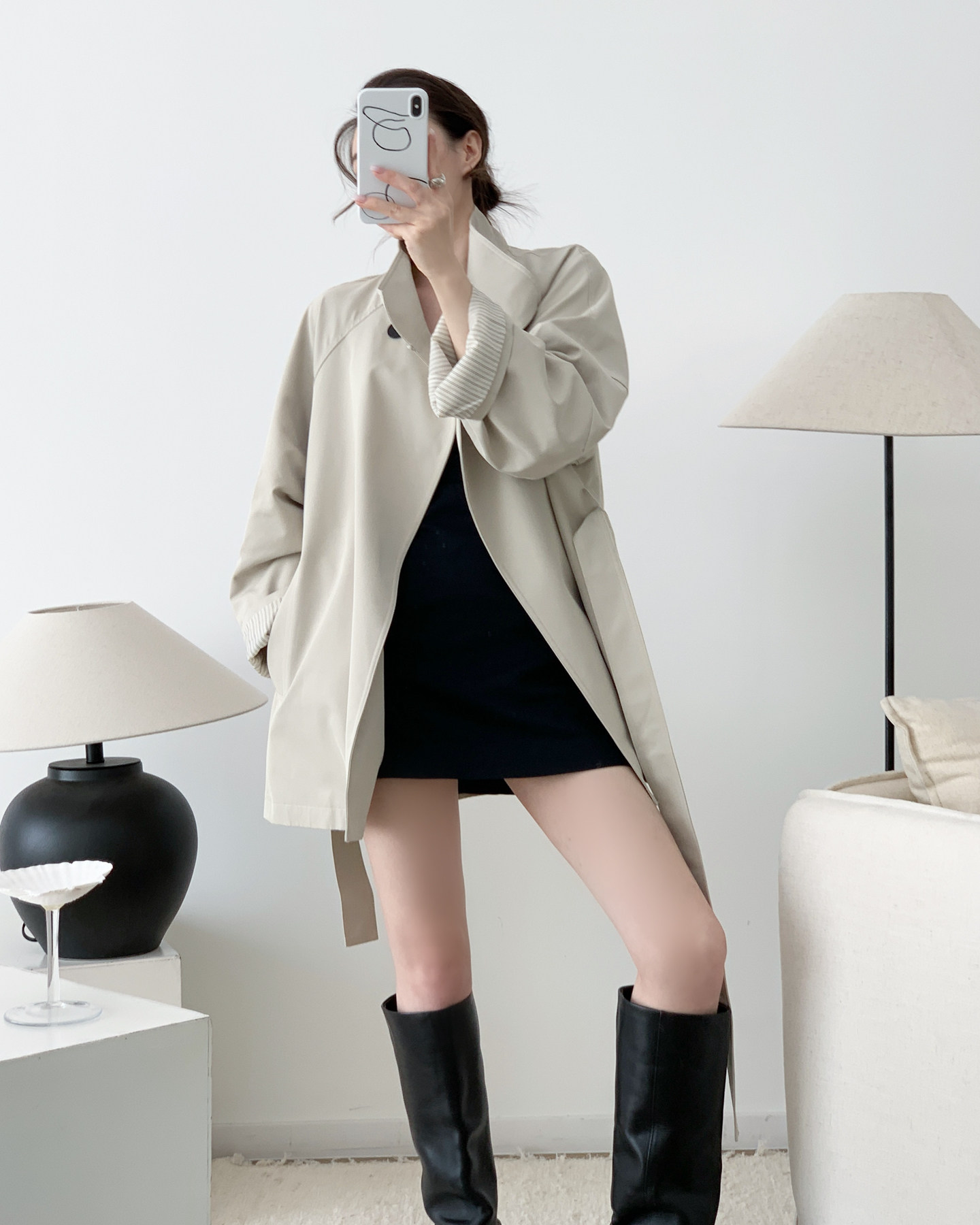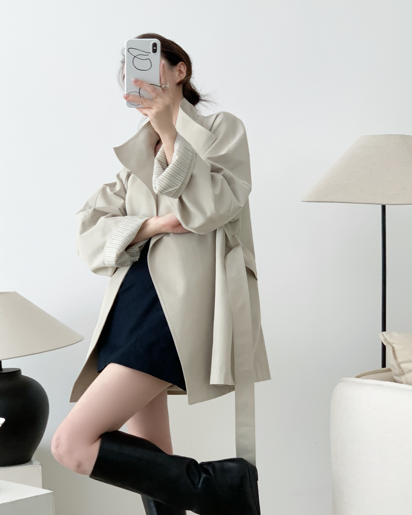 版型寬鬆休閒與通勤並存,長款百搭且氣場強,短款慵輕鬆幹練,布料選用斜紋棉混紡布料,挺括有型,立領設計簡約大氣,領子簡約一粒明扣設計,營造自然斜門襟效果,胸部兩側有貼袋設計,豐富層次感,袖口拼接條紋袖裡,翻折穿著時增加休閒細節。