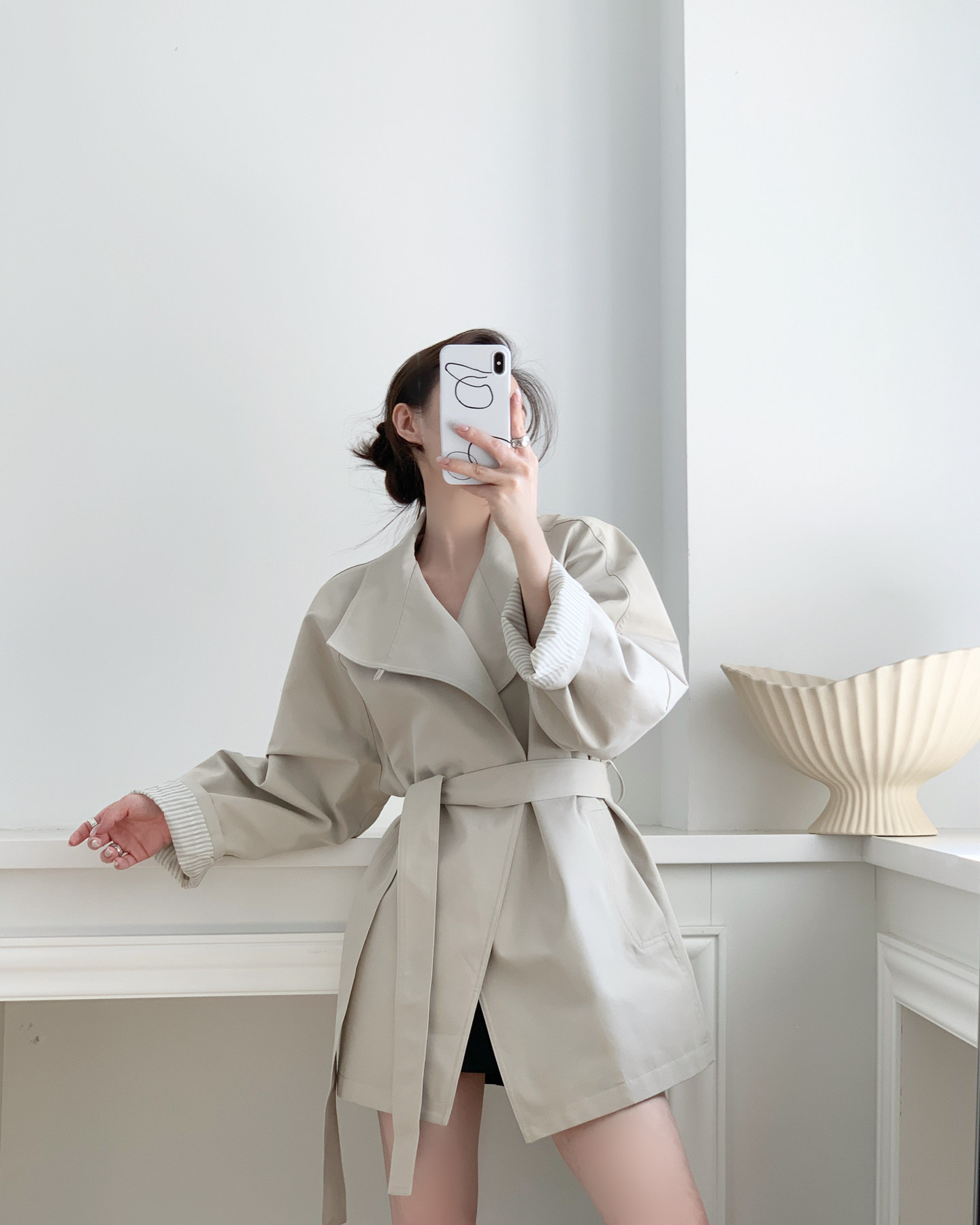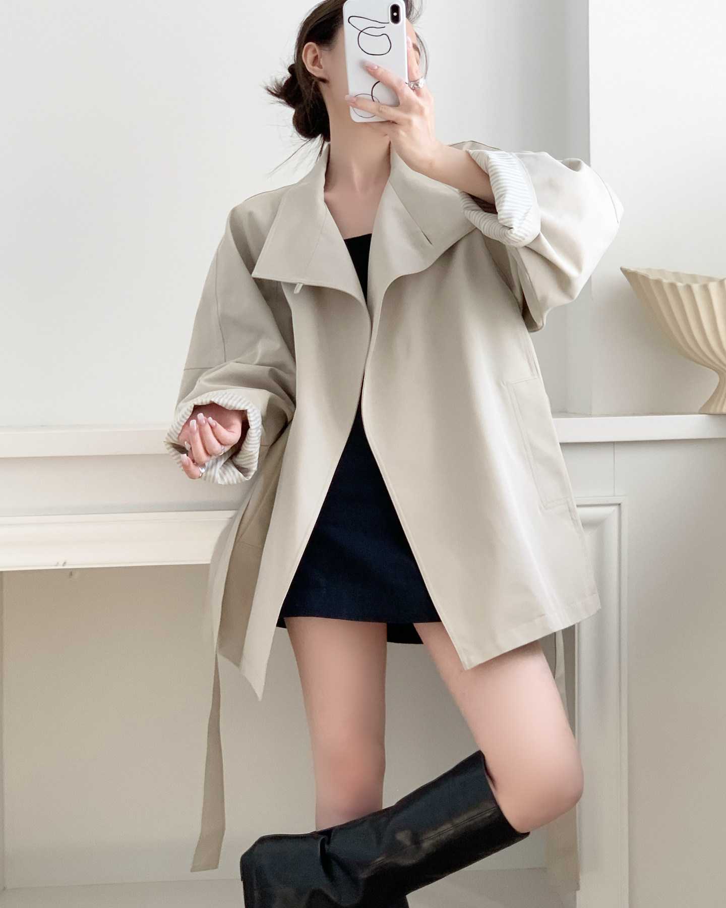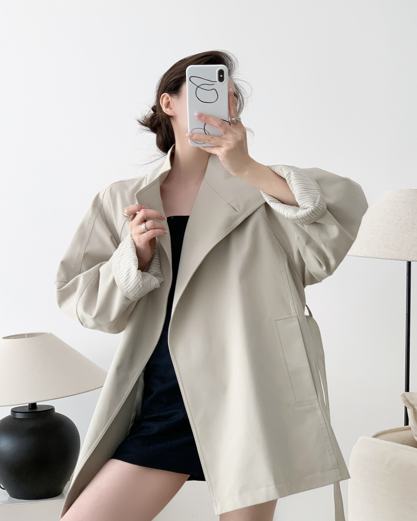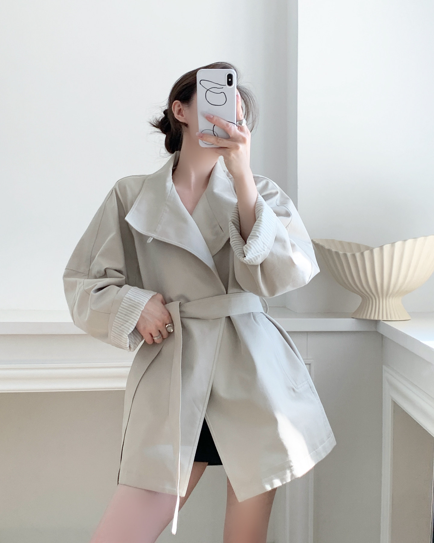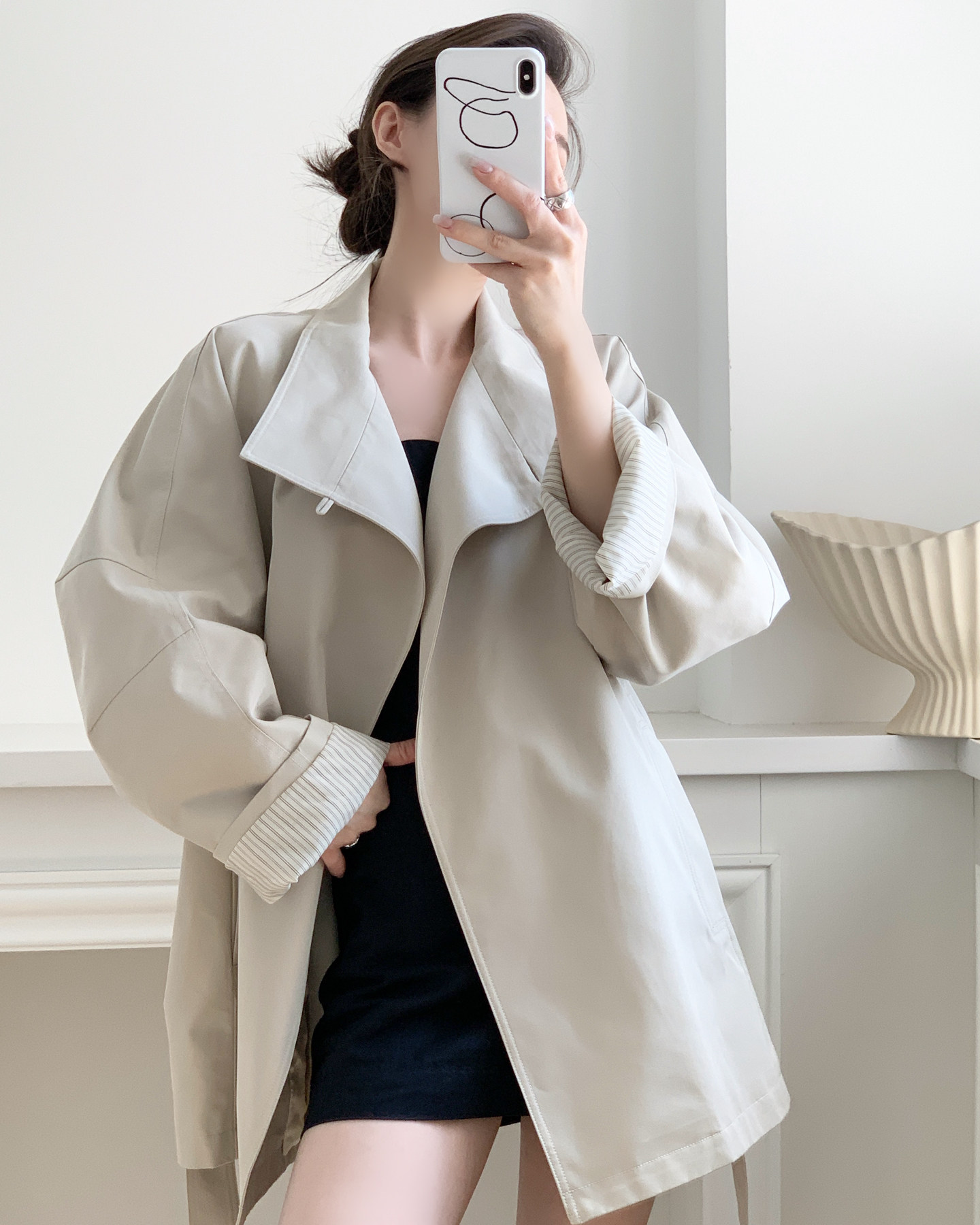 版型寬鬆休閒與通勤並存,長款百搭且氣場強,短款慵輕鬆幹練,布料選用斜紋棉混紡布料,挺括有型,立領設計簡約大氣,領子簡約一粒明扣設計,營造自然斜門襟效果,胸部兩側有貼袋設計,豐富層次感,袖口拼接條紋袖裡,翻折穿著時增加休閒細節。