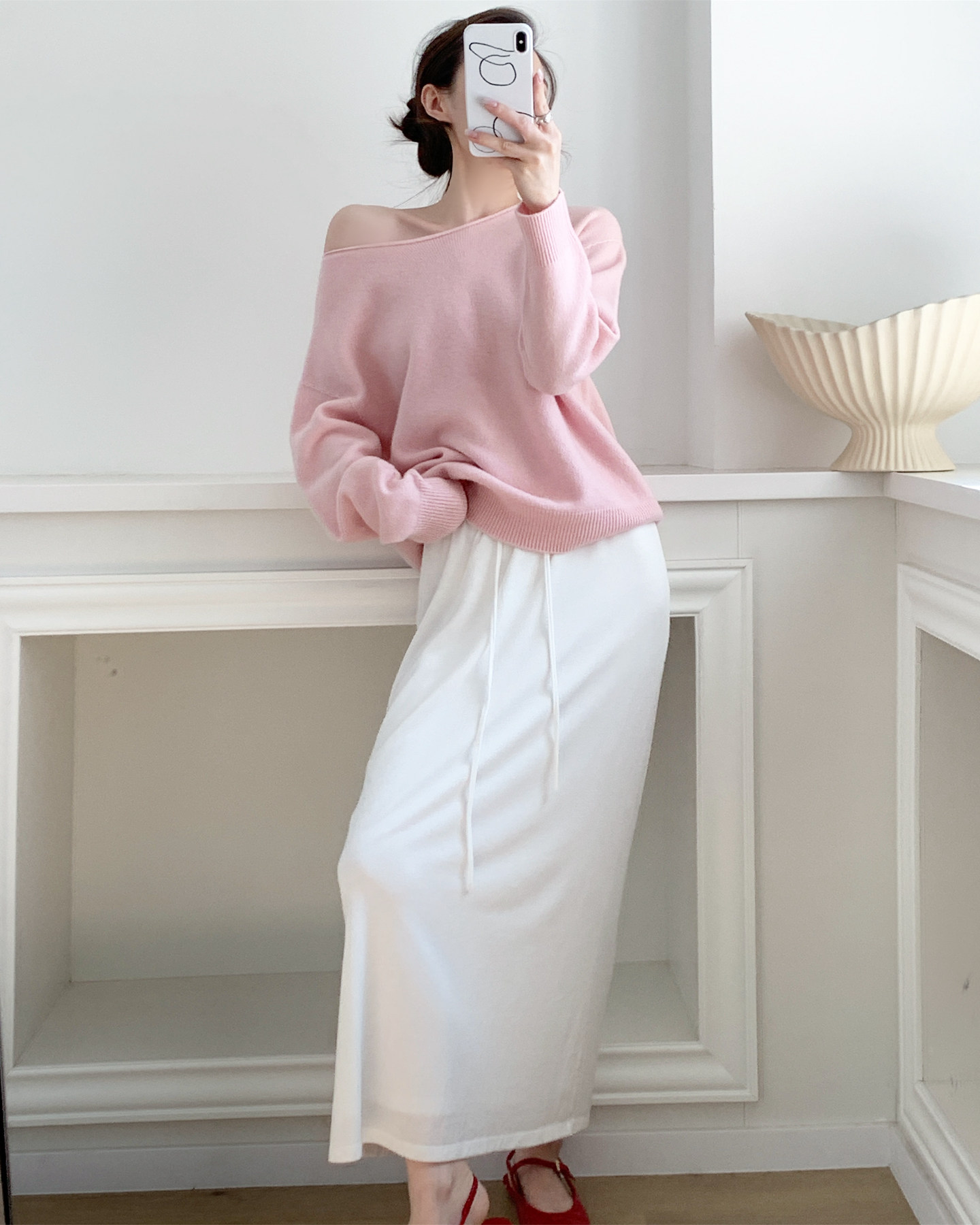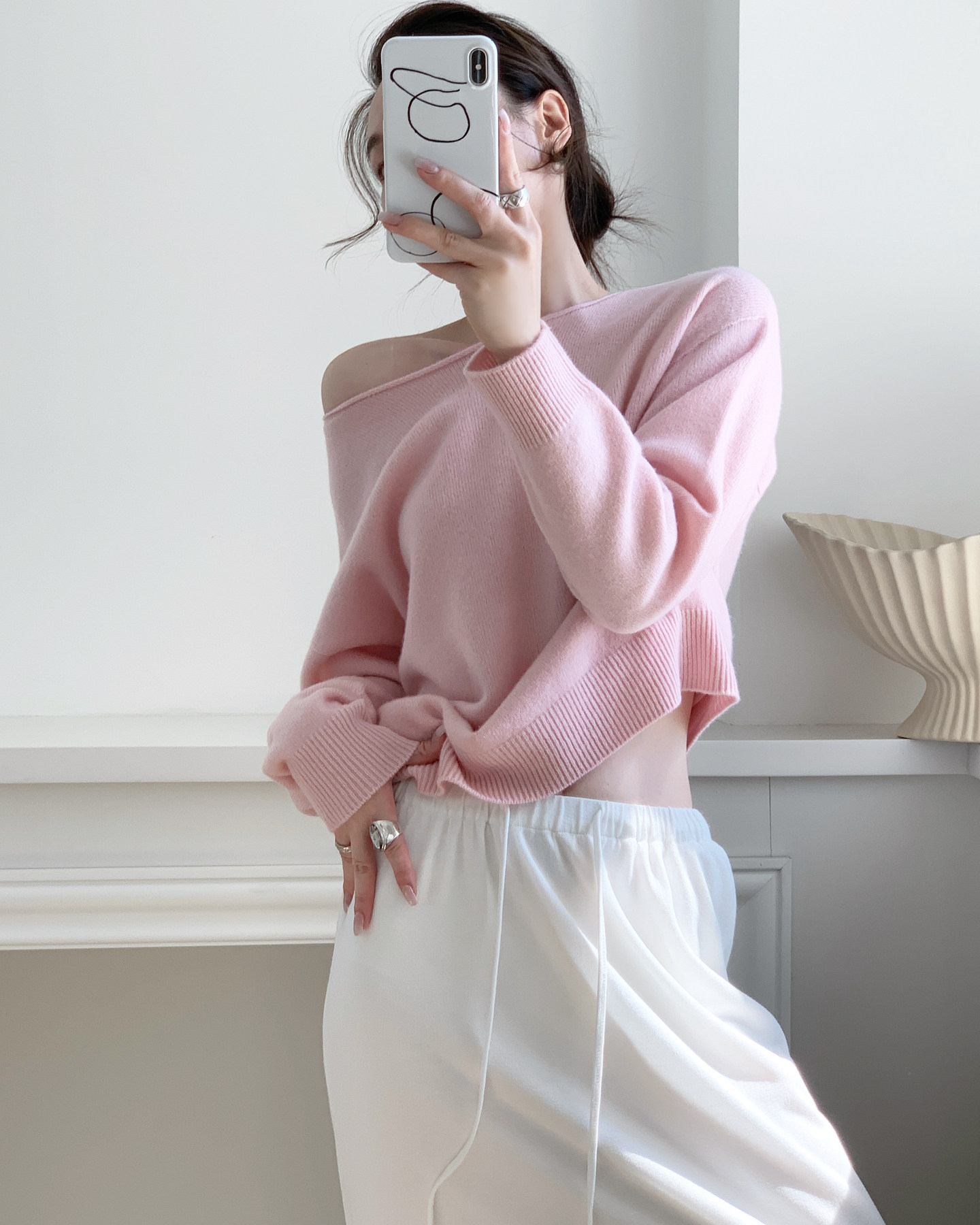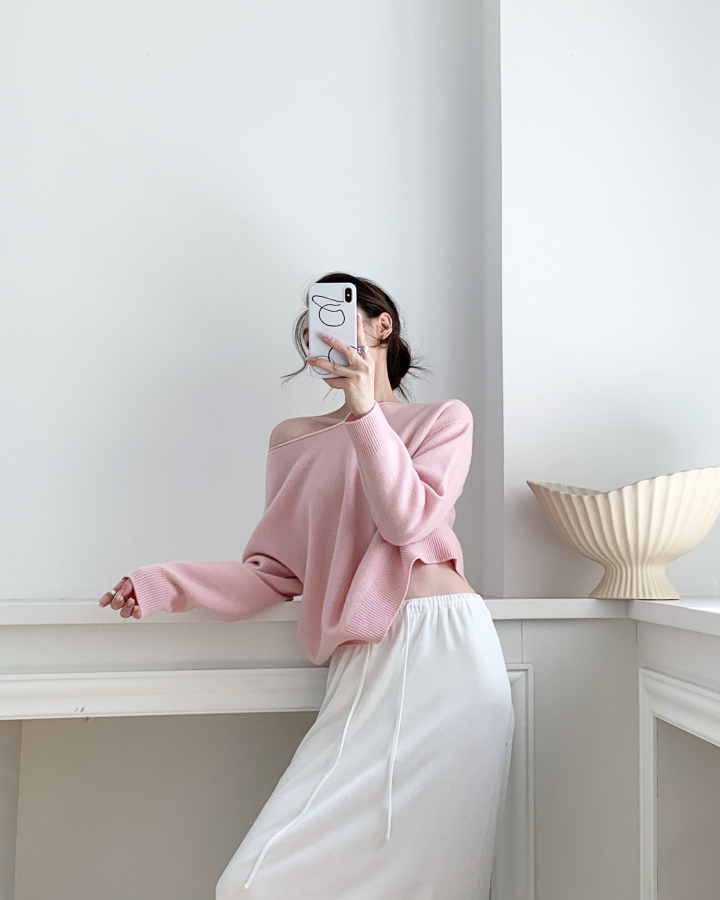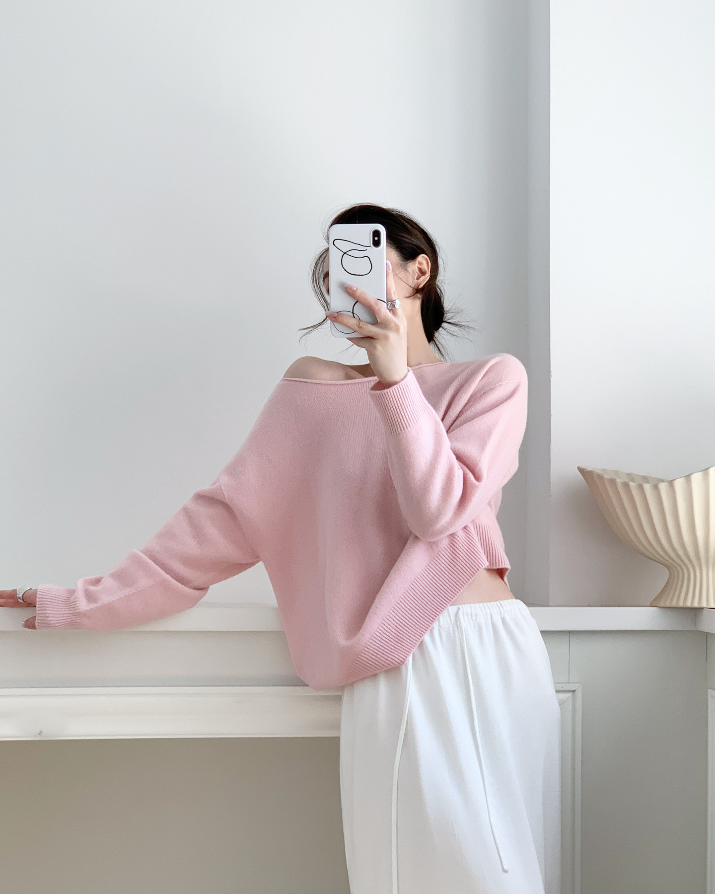 簡約骨感 鏤空長袖針織衫 米白