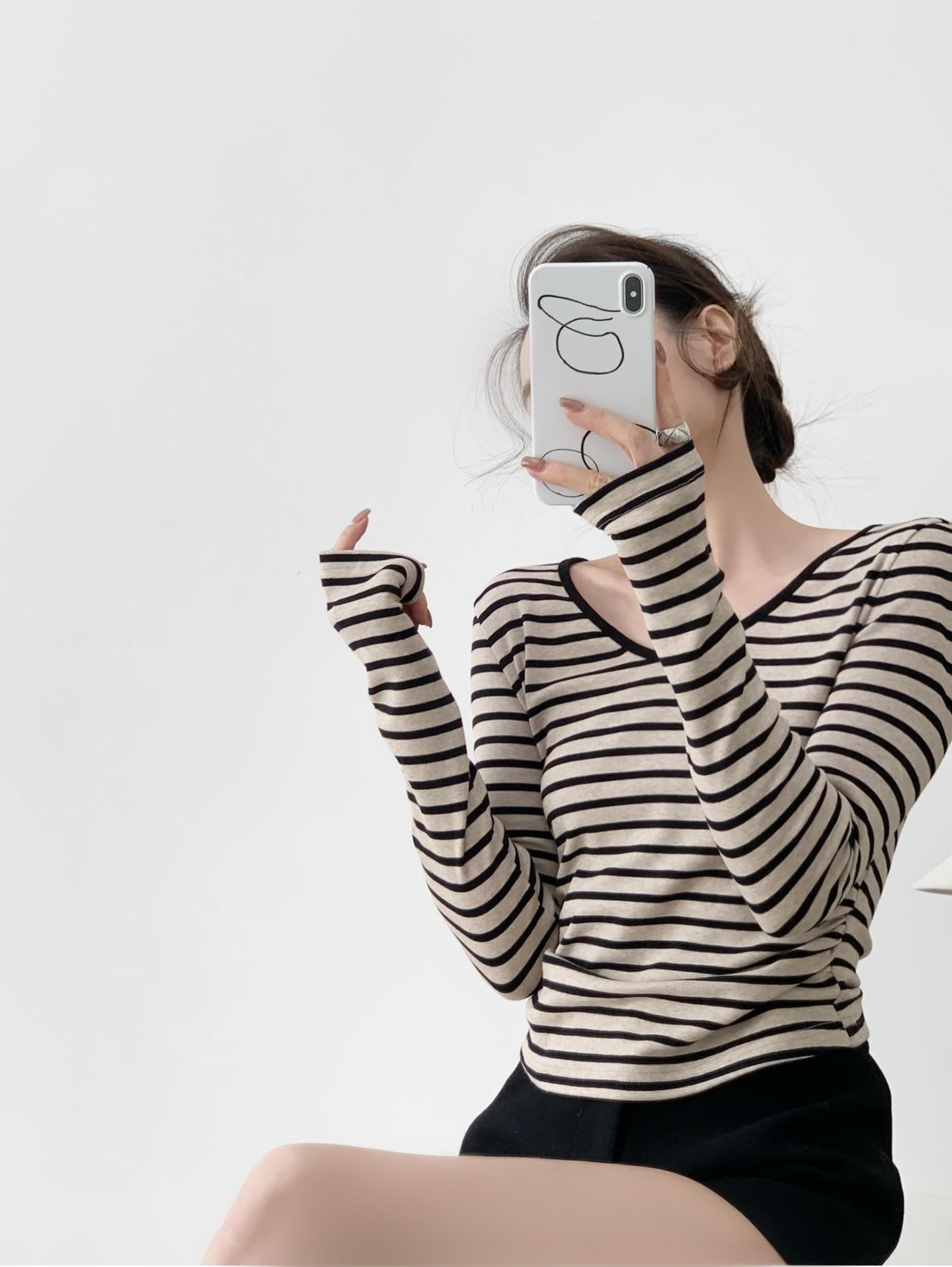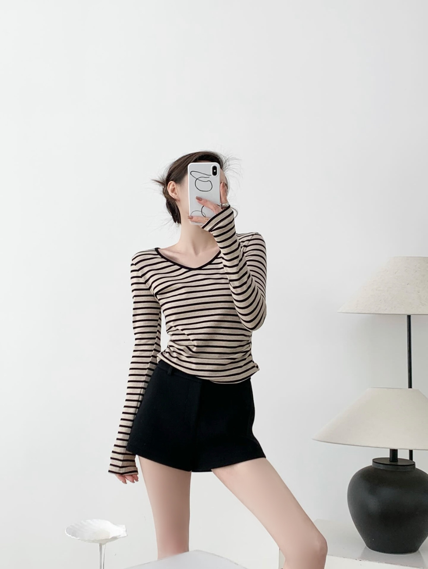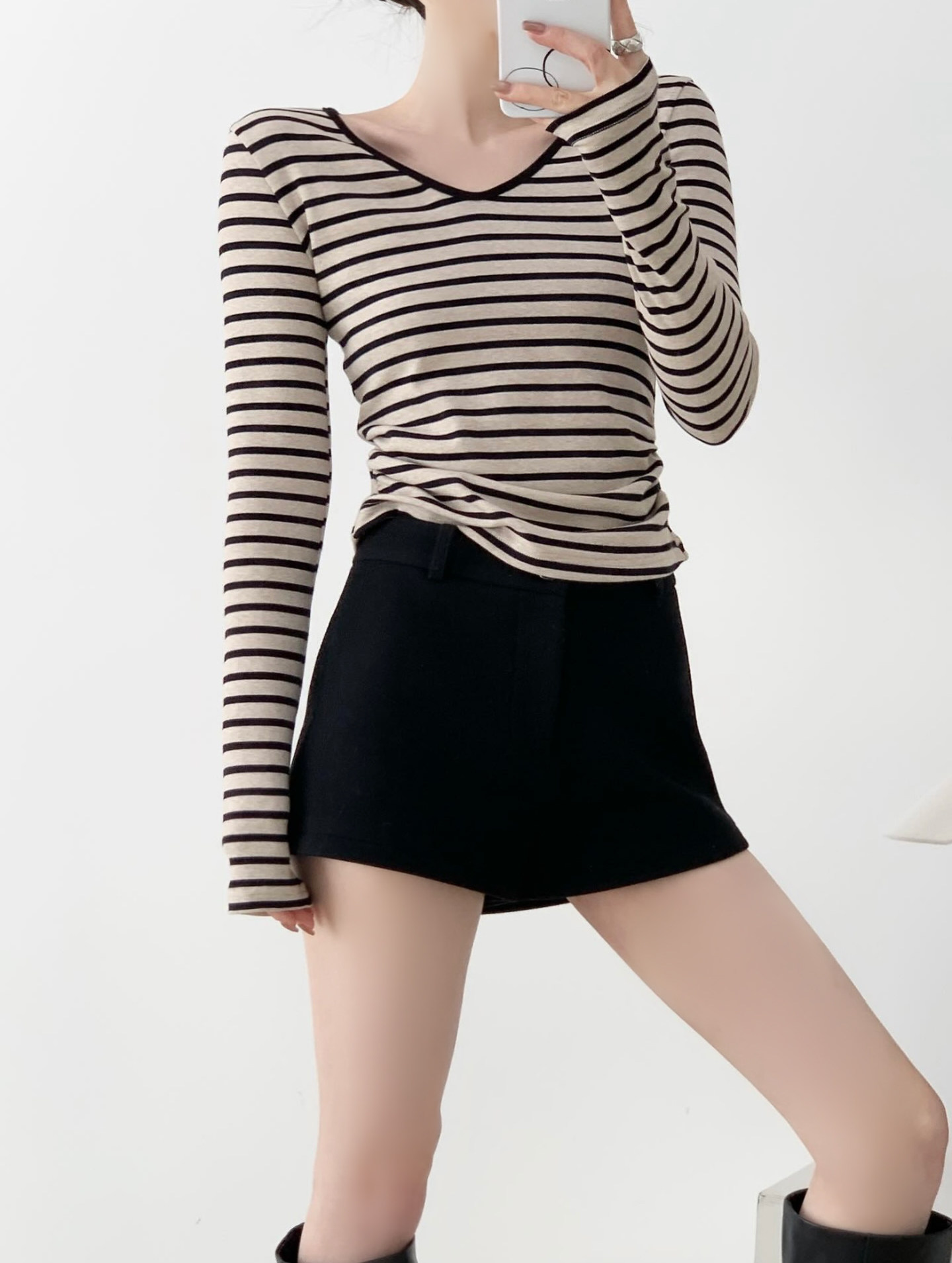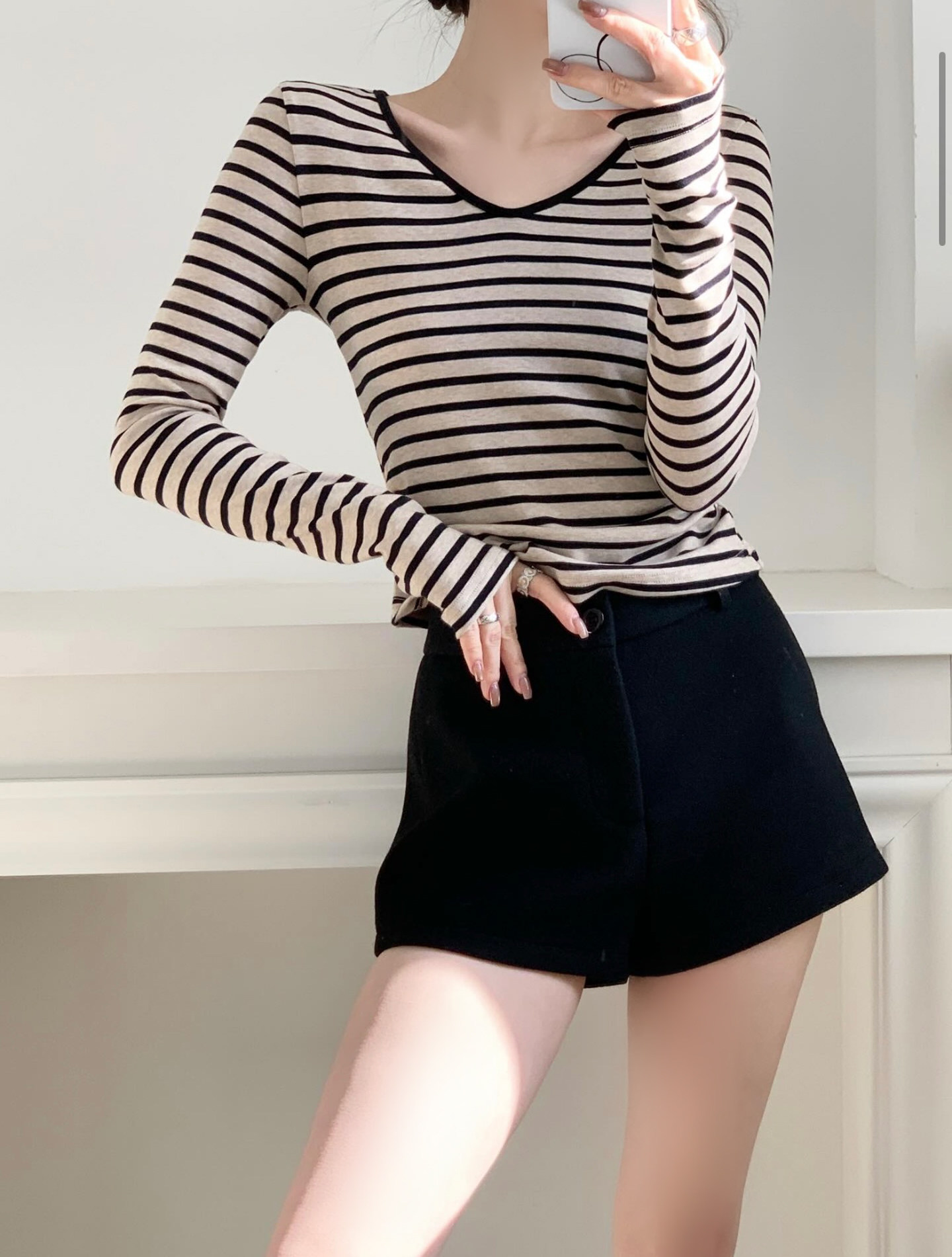 掐腰曲線撞色V領條紋長袖針織上衣,布料採用輕抓絨材質柔軟細膩貼身穿著亦非常舒適親膚,條紋的顏色並非單調的黑撞白,而是黑色與雜杏色的巧妙搭配更顯高級且耐看,大身版型採用掐腰設計更顯著地勾勒出腰部線條,腰部側縫巧妙地加入捏褶處理,對於略有腹部贅肉的女生來說極為友善有效遮掩多餘脂肪,領口採用V領設計不僅修飾臉型還能展現優雅的鎖骨線條,屬於日常經典好穿的一件上衣。